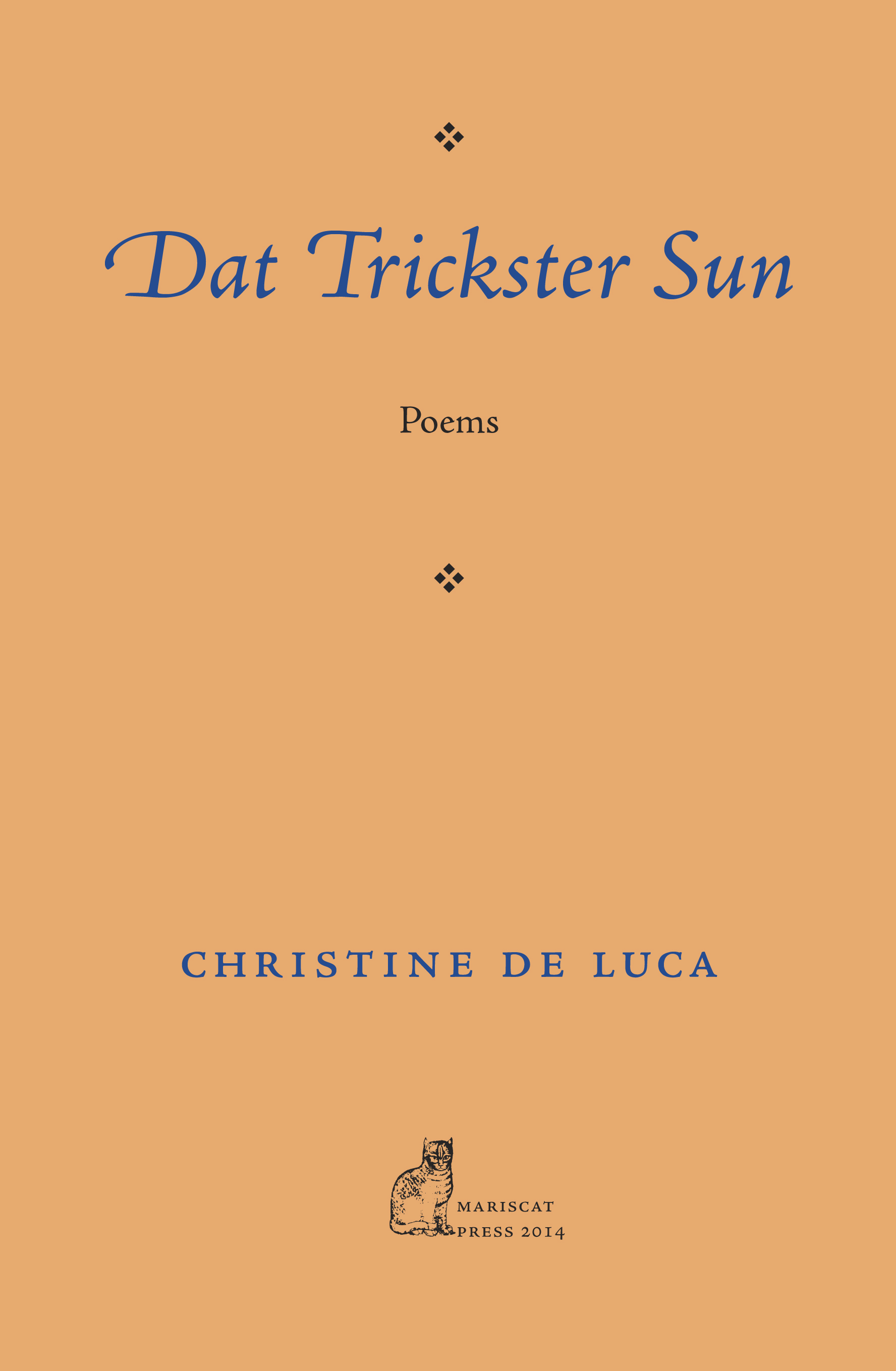 Also! Christine De Luca’s pamphlet Dat Trickster Sun [Mariscat Press] has been shortlisted for the Michael Marks Awards. The winner will be announced at a special dinner (!) at the British Library on 25 November. I’m guessing this isn’t open to the general public, sadly. We are all hoping that Christine will win and no one will spill any of their special dinner on the books, as I believe the British Library librarians get cross about that sort of thing.